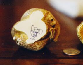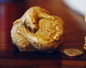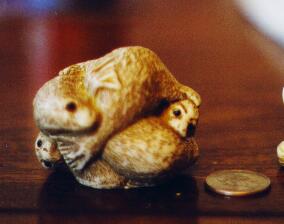 This is the Seal Pile netsuke, carved by Martin Perry. It was authenticated by Perry at Rosemont this year (see initials on bottom view). This is a pre-Harmony Kingdom piece, made of crushed marble and resin. It is not a box, like the current HK pieces, but a single solid piece. This one is a pile of 5 playful seals, and is one of the more rare netsukes. The eyes are painted a shiny blank, and shine with life. I apologize for it being slightly out of focus! :)